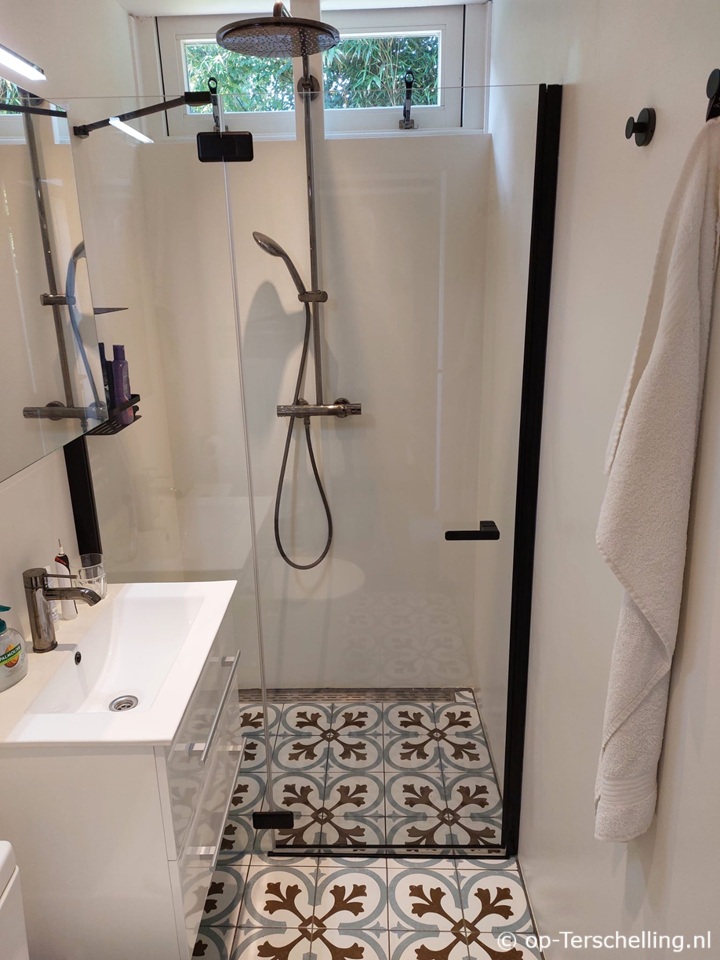 Badkamer met regendouche, wastafelmeubel en toilet.