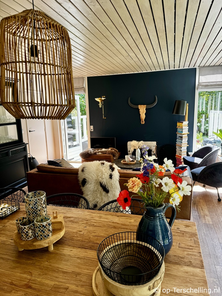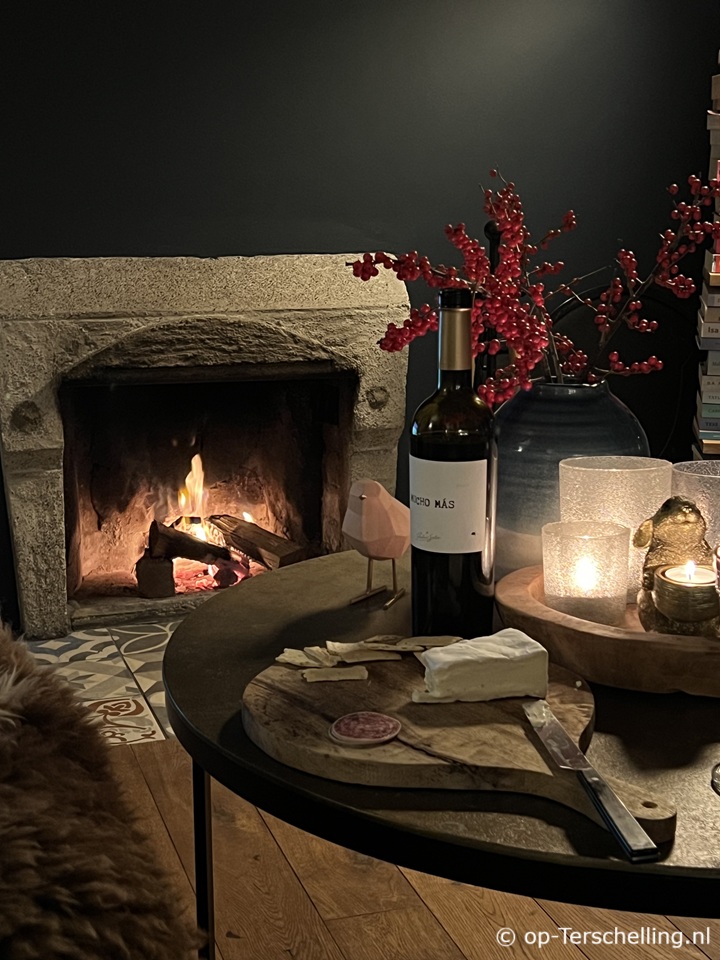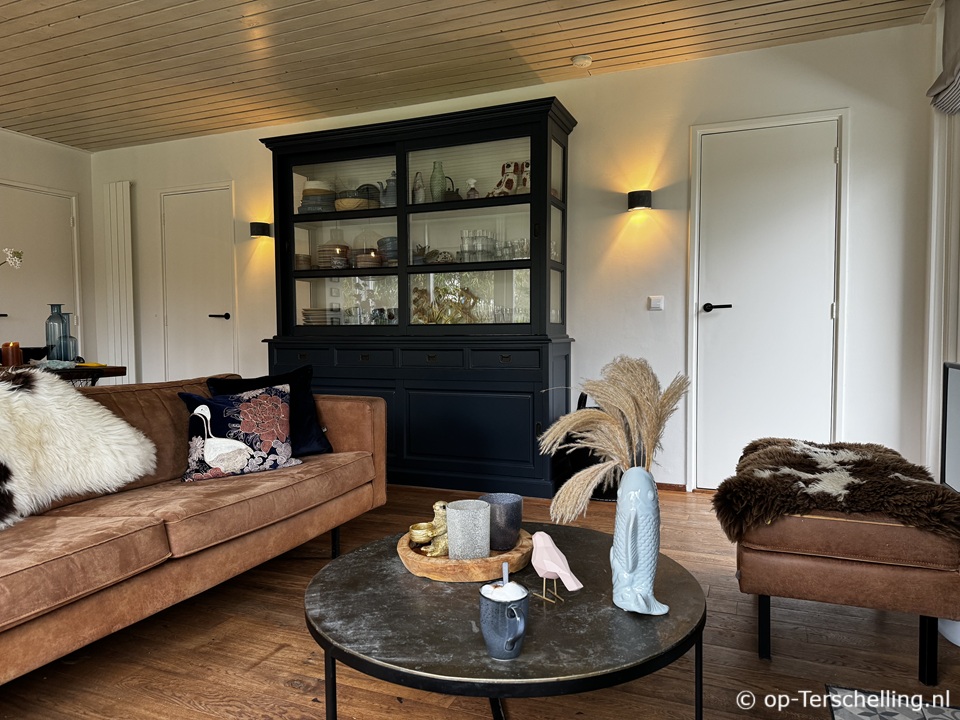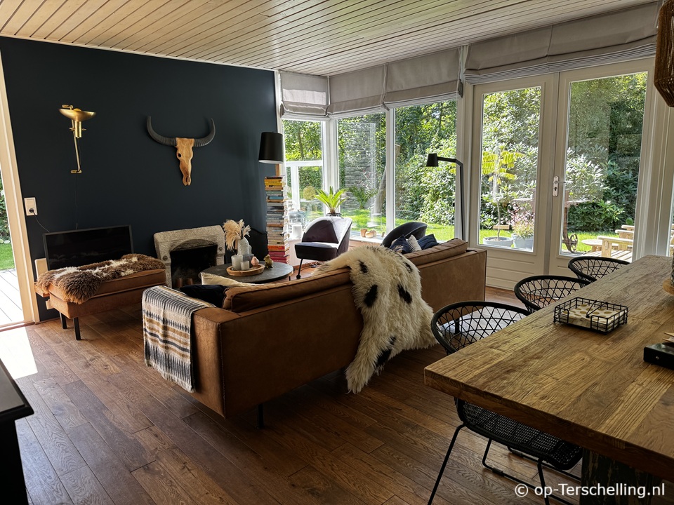 • sfeervolle, lichte huiskamer met 3 zitsbank, 2 fauteuils, grote eettafel en open haard